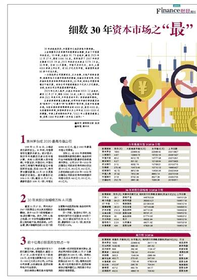 ■采写:新快报记者 涂波 ■制图:廖木兴 30年来起起伏伏,中国股市已经历多轮牛熊转换。 上证指数作为发布最早的股票综合指数,见证了中国股市的变迁。30年前,大盘从95.79点起步,截至2020年12月27日,报收3396.56点。其间经历了2007年的历史最高6124.04点,2015年的历史次高点5178.19点。30年前,仅有13只股票,市值不足百亿元,如今,A股4000多家上市公司、近80万亿元总市值,涵盖国民经济90多个行业大类。 一大批优秀公司脱颖而出,从大金融、大地产到食品饮料、医药和电子元器件等高科技领域,呈献出百家争鸣、百花齐放的良好竞争秩序和成长势态。30年来,有的公司股价涨幅以千倍计算,有的公司市值短期就从千亿步入万亿级别。当然,也有公司从明星股到销声匿迹。 2020年已步入尾声,大盘从年初的3050.12点起步,截至12月27日,报收3396.56点,上涨11.36%。即将到来的2021年是牛年,牛年是否有牛市?投资者满怀期待。 从多家券商研报主题来看,对明年的市场行情多提及的是“结构牛”、“小康牛”和“长期慢牛”等字眼,态度中性或偏乐观。比较乐观的券商预测将会到4000点,甚至4300点;比较谨慎的券商,如国泰君安认为上半年在3100-3500之间震荡。市场上更有期待的声音:“2021年A股能否继续上涨,实现1994年以来第一次年线3连阳?” 1 贵州茅台成2020最高市值公司 1990年11月26日,上海证券交易所创立。30年间,市值榜首的位置多次易主。统计显示,按历年年底最后交易日的市值计算,共有11股问鼎A股市值榜。中国宝安、中国石化、中国石油和工商银行等都荣登过市值冠军的宝座,而在2020年,贵州茅台屡创新高,12月23日更是刷新历史高位,盘中最高价达1906.2元/股。截至12月27日,最新收盘价1830元/股,市值达22988.42亿元,登上2020年最高市值公司榜首。 实际上,在2021年券商策略报告股票热度排名榜中,食品饮料行业中被推荐次数最多的依然是贵州茅台,公司2017年—2019年归属母公司股东的净利润分别达到271亿元、352亿元、412亿元,众多机构给出的2020年—2022年归属母公司股东的净利润预测平均值分别为468亿元、555亿元、651亿元。 2 30年来股价涨幅榜万科A问鼎 截至12月27日,两市共计2567只股票自上市以来实现股价翻倍,其中568只个股涨幅逾10倍,股价翻十倍。其中,万科A、格力电器、ST中安和福耀玻璃等个股上涨均超千倍,排名居前。从行业看,累计涨幅排名前100的个股主要集中在医药生物、食品饮料和信息服务等板块。 另一方面,除退市公司外,也有相对发行价已经跌去80%的个股,如ST毅达发行价为38元/股,最新报价5.28元/股,较为发行价的0.14%。 3 前十位高价股医药生物占一半 时至今日,A股市场中百元个股已屡见不鲜。数据显示,截至12月27日,A股市场百元个股有136只,总市值主要集中在100亿元—800亿元的上市公司。从行业分布来看,以机械设备、医药生物和电子行业居多。 股价拔得头筹的是市值和股价均第一的双料冠军贵州茅台,虽然近两天股价回调,12月27日最新收盘价为1830元/股,依然比第二名石头科技的1032.65元/股高出近800元/股。值得关注的是,前十位的高价股中,医药生物板块占据半壁江山,特别是今年以来股价涨势明显。 今年最高市值TOP10个股 股票简称现价(元)A股流通市值(亿元)总市值(亿元) 上市日期 贵州茅台183022988.42 22988.42 20010827 工商银行4.9713399.73 16720.1920061027 中国平安83.29012.78 14777.0820070301 建设银行6.27601.52 12108.6420070925 农业银行3.159262.74 10768.51 20100715 五粮液275.9210473.4010710.1319980427 招商银行42.728812.69 10656.0620020409 中国人寿37.527812.99 8860.1420070109 中国银行3.186702.34 8527.3920060705 宁德时代312.793861.82 7286.3620180611 30年来股价涨幅榜TOP10个股 股票简称 现价(元)所属同花顺行业相对发行价涨幅:后复权(现金分红)(%)上市日期 万科A28.1房地产Ⅲ446763.5919910129 格力电器59.21家用电器365924.2119961118 ST中安1.71信息服务221359.5619901219 福耀玻璃46.51交运设备197149.8819930610 泸州老窖212.9食品饮料94713.0619940509 云南白药114.53医药生物66191.4119931215 伊利股份40食品饮料51774.5619960312 方正科技4.04电子49222.8419901219 国电电力2.24公用事业49071.6219970318 长春高新434医药生物47829.0819961218 高价股TOP10 股票简称 收盘价:不复权(元)总市值(元) 相对发行价涨幅:后复权(现金分红)(%) 行业 贵州茅台 183022988.4234111.19食品饮料 石头科技 1032.65688.43281.62家用电器 迈为股份 698362.96 1134.47 机械设备 爱美客 609.02 732.04 414.94 医药生物 卓胜微 583.31049.94 2880.84电子 康华生物 455.71273.43 547.59 医药生物 长春高新 4341756.4947829.08医药生物 吉比特 412.97296.78704.94信息服务 康希诺 407.2660.7994.17医药生物 迈瑞医疗 402.54893.16729.92医药生物