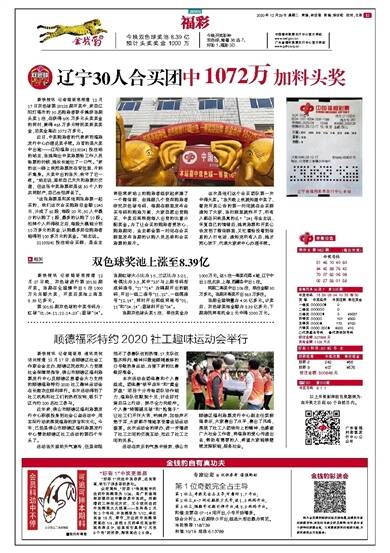 辽宁30人合买团中加料头奖 新快报讯 记者陆妍思报道 12月17日双色球第20128期开奖中,来自辽阳灯塔市的30名购彩者联手擒获当期头奖1注,在获得605万多元头奖奖金的同时,兼得463万多