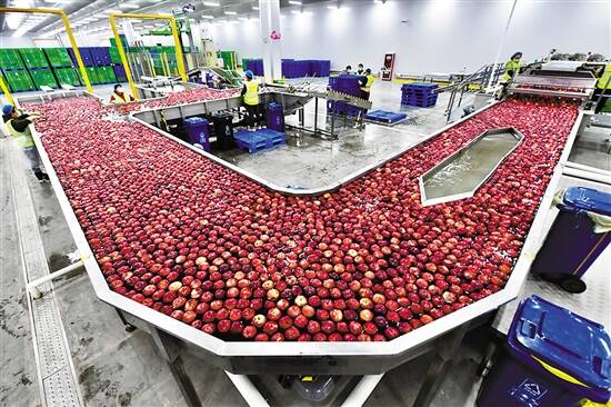 ■阿里西安仓,为了减少磕碰,机器人搬运上料,清洗后用水流运输果子。 |