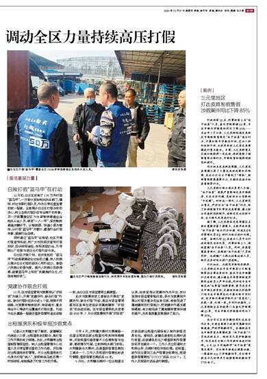 盘活基层力量 白云打假“蓝马甲”在行动 12月初,白云区定制了1.35万件打假“蓝马甲”,一方面分发给相关执法部门,镇街、村社专职打假队员,作为日常巡查监管的统一服装,全面展示白云区打假治