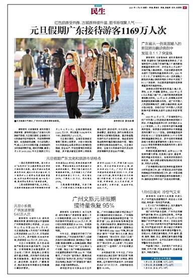 新快报讯 记者李佳文 实习生苏昉 通讯员穗文广旅宣报道 截至1月3日傍晚的数据,2021年元旦假期广州共接待市民游客501.94万人次,同口径比较恢复程度为94.79%,实现旅游业总收入38.45