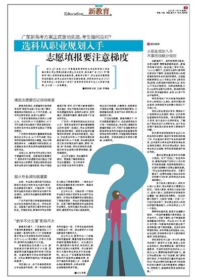 近日,《广东省2021年普通高等学校招生考试和录取工作实施方案公布》(简称《实施方案》)正式发布,标志着广东2021年“新高考”进入实质性落地实施阶段。新高考方案下,学生该如何提前做好选科规划,高考生该如何进行志愿的填报,学校将如何应对2021年高考招生?记者采访了多位广东高校资深招录专业人士和高中教师,为大家一一支招解答。 ■新快报记者 王娟 罗清峣 填报志愿要切记保持梯度 新高考改革后,志愿填报与投档录取采用“院校专业组+专业(类)”模式,普通类本科院校设45个平行志愿。这对考生报考来说,会有什么影响? 广东多位高校招生办资深人士都认为,与往年的15个志愿相比,45个平行志愿为考生提供了更多选择空间,但同时也对考生选择专业提出了更高的要求。 广州软件学院执行董事兼常务副院长迟云平认为,45个平行志愿,考生报考的选择权得到充分尊重。考生可根据自身专长、兴趣爱好与职业规划,以志愿组合形式灵活多样选择理想的院校和专业。 但他认为,高中生对专业的认知水平普遍相对浅显,在新高考志愿模式下,更多的平行志愿数对他们提出了更高的专业认知要求,到底以院校排名还是专业排名作为填报参照,考生可能会拿捏不准;同时,对于部分教育资源欠发达地区,考生可能因为缺乏专业系统的志愿填报指导,选择听从家长、老师建议,甚至跟风填报,最终选择了不适合的专业。 广东另一所高校的招生办主任也认为”更多的选择并不意味着能够做出好的选择“,他建议,考生应根据根据自身实际情况、院校专业组的设置情况科学安排,多咨询专家意见。他认为,无论是往年的15个院校志愿还是新政策中的45个志愿,考生都应按照自己的实际情况进行填报,要有“冲、稳、保”的思路,同时在学校和志愿组内的专业选择方面要有梯度,避免被调剂。 迟云平也建议,考生填报志愿时,要提前了解拟报院校专业设置情况,充分考虑专业计划数与选考科目要求,结合自己的成绩、兴趣特长、体检等各方面综合考量。结合拟报高校情况,分梯度填写志愿,有助于加大录取到心仪高校的几率。 不过他也提醒,新高考模式下,平行志愿数虽增加不少,但在该录取批次只有一次投档机会。考生须认真做好志愿填报准备工作,可到广东省教育考试院官网的选考科目查询系统查看拟报学校选考科目要求,仔细查阅拟报高校招生章程,并参照该校往年录取分数线,合理报考。 服从专业调剂很重要 此前,专业服从调剂是可在招生院校未完成计划的专业内进行调剂,但在新高考方案中,只能在同一个院校专业组未完成计划的专业内进行专业调剂。这将对考生填报志愿带来哪些影响? 广东外语外贸大学南国商学院招生办处长助理郑芝鸿认为,对考生来说,这提高了读到自己喜欢的专业的机会。对高校来说,新高考对专业的硬实力提出了更高的要求,一些专业不再受本校最低录取分的保护,倒逼专业提升办学质量。 迟云平认为,只能在同一个院校专业组未完成计划的专业内进行专业调剂,对考生志愿填报的合理性提出了更高的要求,考生必须提前做好规划,全面了解所填报院校专业组具体专业情况。他同时建议考生服从专业调剂,避免因专业不服从造成退档。 “数学不分文理”影响不大 新高考方案下,广东高考分为春节高考和夏季高考,夏季高考由3门全国统一高考科目和3门广东省普通高中学业水平选择性考试科目组成,实行“3+1+2”考试模式,不再分文理科,数学科目也确定不分文理。 有高校招生办负责人认为,新的政策实行数学科目不分文理,是国家更加重视基础学科的学习的体现,也意味着对文科生有更高的要求,文科生需要和理科生“同等地重视数学”。 郑芝鸿认为,由于各高校录取是以专业组进行投档,同一专业组的选考科目基本一致,不同专业组的投档分数线也不一样,因此数学不分文理在新高考中影响不大。 迟云平认为,数学作为一门思维训练的基础课,着重考查学生的理性思维和逻辑推理能力,以往通过文科、理科数学分卷考试,存在争议,新高考已经淡化文理界限,所以数学不再分文理对学生来说并不存在影响。他认为,广东省新高考改革按照有利于促进学生健康发展、有利于高校科学选拔人才,注重学生综合素质培养,为学生的职业选择提供更多可能。