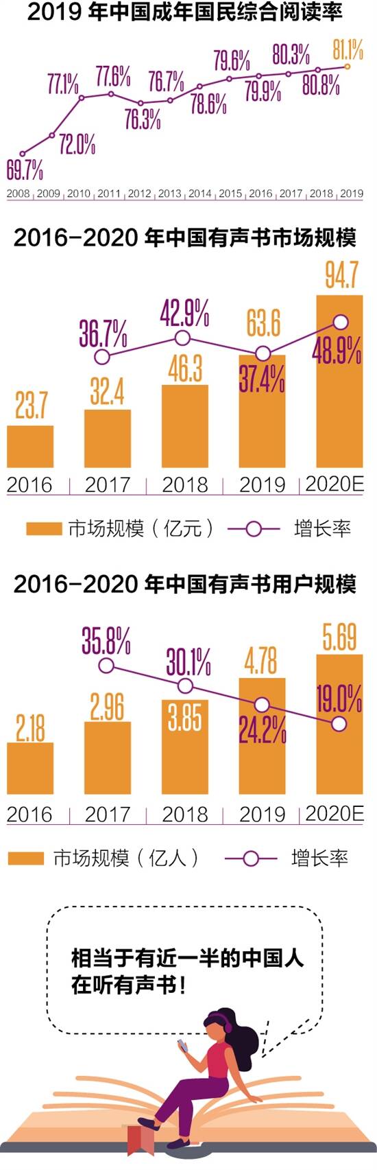 随着互联网与数字化技术的不断发展,近年来,听书成为越来越多人的爱好,有声书市场也随之蓬勃发展。根据艾媒咨询发布的《2020年中国有声书行业发展趋势研究报告》显示,2016年中国有声书行业市场规模为23.7亿元,历经3年高速发展,在2019年达到63.6亿元,持续增速高于30%。而因疫情原因,线上消费持续增强,2020年有声书行业发展进一步提速,行业规模达到95亿元左右。 国民阅读率的提高,也是有声书市场扩大的重要背景。数据显示,2019年网络文学行业市场规模达到201.7亿元,创作规模达2590.1万部,3452部网络文学翻译成外文出版,IP新改编数量9656部。作者数量达到1936万人, 90后年轻作者占比达44.6%,新人渐成主力。中国新闻出版研究院发布的第17次全国国民阅读调查显示,2019年我国成年国民的综合阅读率为81.1%,较2018年提升了0.3%,数字化阅读方式(网络在线阅读、手机阅读、电子阅读器阅读等)的接触率为79.3%,较2018年上升3.1%。 用户规模方面,2018年中国有声书用户数量为3.85亿人,2020年达5.69亿人,预计未来用户数量接近6.5亿人,相当于有近一半的中国人在听有声书。 根据前瞻产业研究院《中国电子阅读器行业市场研究与投资预测分析报告》,有声书逐渐进入成熟发展期。传统有声阅读产品由线下的音频业务复制迁移而来, 2009 年中国移动最早上线有声阅读服务,在此之后以 PGC 内容为主的豆瓣 FM、蜻蜓 FM 等产品相继上线;2013 年至2014年期间,随着国内4G网的商用落地,移动互联网加速渗透,有声阅读移动端APP应用快速发展,喜马拉雅、考拉 FM 等移动音频应用上线,此后资本涌入,推动有声阅读市场迅速成长,竞争加剧;从2018年开始,有声阅读市场在内容、渠道及商业模式方面不断演进,逐步走向成熟、多元化发展阶段。 有声书,是指运用现代数字技术,以文学作品为内容,固定单个或多个表演者声音并存储于数字文件之中,利用网络平台向公众传播的音频产品。从最早的唱片教材、磁带出版物、广播剧,再到今天的在线音频,在信息技术进步的推动下,有声读物的市场越来越大。像喜马拉雅、懒人听书、荔枝、蜻蜓FM、酷我畅听、番茄畅听等,都是为公众所熟知的有声书阅读平台。 看看谁是“听书者”? 爱听书的娃比成年人多 听书的娃比成年人多:8岁以下儿童听书率最高 数据显示,在用户群体中,0-17周岁未成年人的听书率为34.7%,较2018年平均水平(26.2%)提高了8.5%。其中0-8周岁的用户比例最高,达到36.5%。18岁及以上的用户群体比例最低,为30.3%。分析师认为,声音具有陪伴属性,有声书在亲子教育、幼儿陪伴场景中潜力巨大,儿童有声书市场前景开阔,是行业当前需要填补的一大方向。 听书的男性比女性多,26-40岁青壮年是主力 数据显示,有声书用户中,男性比例比女性高出13.2%。在年龄分布上,有声书用户呈现出分散化特征,其中31-40岁用户占34.9%,26-30岁用户占29.1%,加起来占总量的六成以上。 一二线城市居民更爱听书,本科学历用户超一半 数据显示,北上广深居民收听有声书的比例达到31.8%,新一线和二线城市分别为16.9%和24.9%,三四线城市较低,分别为15.9%和10%。 从学历分布上看,大学本科学历的用户为52.4%,大学专科用户为27%,其余学历占比较小。 过半用户在睡前听书 非学习目的占比超七成 数字化将持续改变我们的生活和工作,未来的人工智能与5G技术将给有声书行业带来极大的革新,带动有声书市场的持续增长。AI语音将成为我们定制化的虚拟主播,5G互联技术将带来场景上的拓宽,数据收集和人工智能将为平台构建用户画像和了解用户阅读偏好提供更多支撑,语音功能的交互音频格式将为用户提供崭新的体验,智能终端将给我们带来更好的陪伴体验。 随着数字阅读对用户日常休闲娱乐生活的渗透,用户对阅读场景的需求也呈现多样化发展趋势。传统的阅读场景包含移动阅读APP、有声阅读 APP等,覆盖面最为广泛。除此之外,电子阅读器、绘本阅读器、智能音像/耳机等硬件设备的发展也带动了阅读场景多样化,使得用户可以在不同时间内和不同场景下进行阅读,为用户带来了不同的阅读体验。未来随着5G技术的发展落地,数字阅读场景和阅读模式有望进一步细化并提升用户阅读体验,在更大带宽与更快传输的加持下,阅读+VR/AR 沉浸式阅读以及高音质听书模式均有望快速实现。 数据显示,大部分有声书用户的听书时间在30分钟-1个小时,达到36%。1-3个小时的用户占32.8%。按场景看,睡前(56.1%)、运动散步(36.5%)、做家务(33.9%)、上下班通勤(32.8%)是最多人选择的听书场景。此外,不同听书目的的有声书用户分布均匀,其中目的为“学习获取知识内容”的用户为25.4%,而以非学习目的听书的,其中包括“调整情绪、安抚心灵”、“轻松娱乐”和“打发时间”为目的的用户总和达到59.2%。 ■策划: 新快报记者 罗韵 ■统筹: 新快报记者 梁彧 ■采写: 新快报记者 罗韵 ■制图: 廖木兴