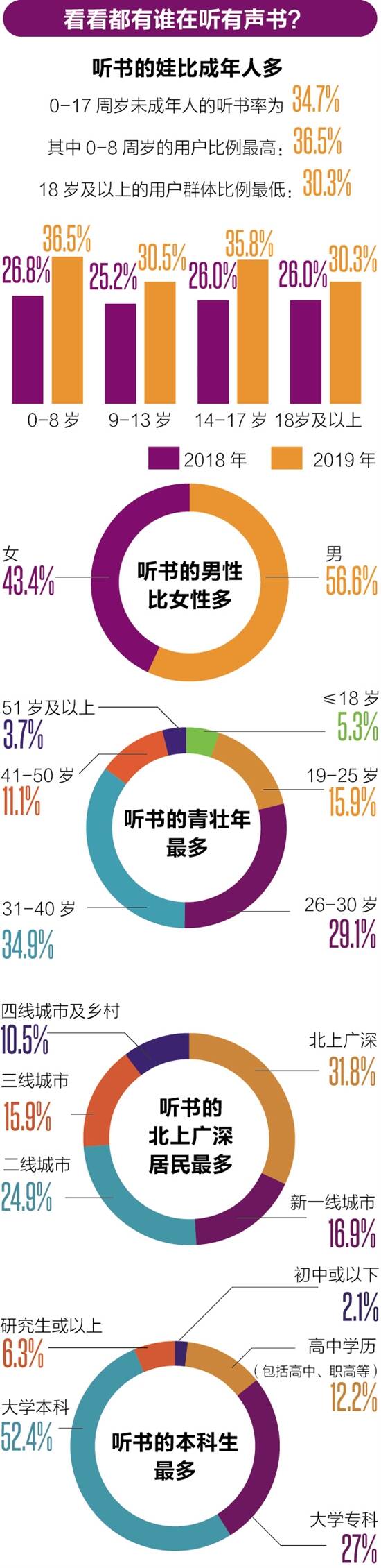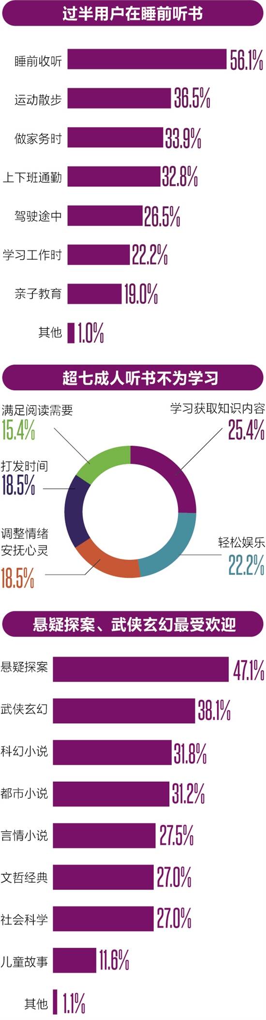 悬疑和武侠最受欢迎 用户更爱轻松娱乐类 按照内容分类,有声书可分为言情、悬疑、都市、幻想、武侠、历史、官场商战等。数据显示,悬疑探案类最受欢迎,占比47.1%,喜爱收听武侠玄幻类的用户也达到了38.1%。分析师认为,虽然知识付费有效刺激了行业发展,但娱乐应用仍然是有声书首要的场景。 有声书用户更偏好轻松娱乐类的内容,网络文学或类型小说将是其中的热门产品,而掌握了大量优质IP的网络文学平台将在有声书行业中占据巨大优势。可以预见,未来有声书行业规模将持续上涨,渗透率逐年提高,基于IP构建了完整生态链的版权方将不断扩大自身在有声书行业中的市场份额,未来有声书行业集中度有望逐步提升。 数据还显示,一年阅读4-7本书和一年阅读8-11本书的用户比例各占比三成,与一年收听4-7本书和一年收听8-11本书的用户群体比例高度近似。分析师认为,年均阅读量和年均听书数量的分布特征相似,说明了有声书是居民在阅读时的重要媒介。在选择有声书的时候,48.1%的用户最优先考虑的因素时有声书本身的内容,其次是主播的声线及能力(27%),以及是否由IP改编(19.1%),价格因素影响较弱,仅占5.3%。 纸质书、影视剧同样影响着用户对有声书的选择。数据显示,在问及“看完某本书或某部影视剧之后,您有多大意愿去收听它的有声书”时,39.7%的受访用户表示“比较愿意”,28.6%的用户表示“非常愿意”,持积极意愿的用户所占比重相对较高。分析师认为,纸质书和影视剧对有声书具有驱动效应,有声书能够作为其互补产品,具有互补效应。纸质书和影视剧的大火也会带动有声书销量。因此,在纸质书、在线小说、影视剧等更新时,同步上传有声书能提高IP的影响度。 听书是种理性消费? 用户更希望免费听书 传统的有声阅读行业商业变现模式主要以免费听书+广告变现为主,随着各大平台内容策略的推进和产品矩阵的丰富,有声阅读商业模式同样呈现多元化发展趋势。当前,有声阅读行业的商业变现模式包括打赏+分成、内容付费、会员 订阅、IP 衍生及周边产品销售等,成为有声阅读行业重要的收入来源。 目前有声书行业的利润薄弱,版权支出占有声读物制作成本支出的比重日益增高,2019年各头部音频平台净利润普遍不尽如人意。这折射了当前行业未有一个健康的商业模式。 随着有声书行业的发展,企业应积极探寻更加合适的商业模式,采用多元化盈利模式,逐步摆脱当前盈利少甚至无盈利的状态,进一步拓展利润空间。在有声书用户增量减缓的情况下,如何发力营销,组合免费、付费、订阅、会员、打赏等模式,提高用户付费率和付费金额,寻求新的营收增长动能,是企业需要着重考虑的问题。 那么,用户是否愿意为有声阅读埋单呢?调查显示,20.1%的用户不愿意对有声书进行付费,他们希望能够免费听书。而付费预算在10-20元的用户占比最高,达到31.2%。实际付费分布比例与付费预算大体重合,付费金额在10-20元的用户将近四成。 分析师认为,用户实际付费金额与付费预算大体相符,属于理性消费。用户消费意愿逐步养成,后续内容质量可能成为用户的关键激发因素。 数据还显示,45.5%的受访用户对有声书以插入广告的形式代替付费形式的商业模式表示“比较可以接受”,19.6%的用户表示“完全可以接受”,“完全不能接受”的只有2.1%。可以看出,免费模式前景利好,用户免费模式将是行业未来的重要商业模式组成部分。 ■今晚,你将听着哪本书入睡? ■数据来源:艾媒咨询《2020年中国有声书行业发展趋势研究报告》、中国音像与数字出版协会、中国新闻出版研究院《第十七次全国国民阅读调查》、前瞻产业研究院《中国电子阅读器行业市场研究与投资预测分析报告》、草莓派数据调查与计算系统