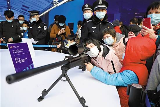 ■小朋友在体验枪支装备。 孙毅/摄 |
