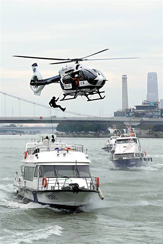 ■1月10日是首个中国人民警察节,广州警方在海心沙附近水域进行水空综合反劫持科目演练。 新快报记者 夏世焱/摄 |