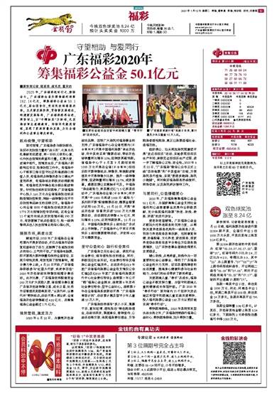 ■新快报记者 陆妍思 通讯员 曹欣然 2020年,广东福彩起而行之、接续奋斗。广东福彩全省共销售福利彩票162.14亿元,筹集福彩公益金50.1亿元,居全国首位,受到民政部通报表扬。立足新发展