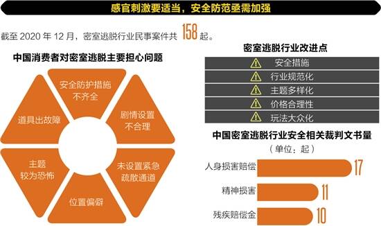 感官刺激尺度备受质疑 行业安全防范亟需加强 密室逃脱受欢迎程度的同时,其发展过程中也显露出不少问题。其中用户最为关注的便是安全问题和行业规范化问题。艾媒调查发现,消费者最担心的问题主要是安全防护措施不齐全、未设置紧急疏散通道、开设地点不合规范等安全问题,其次是对于剧情难度无法适应的担忧。数据显示,截至2020年12月,密室逃脱行业涉及民事案件共158起,其中包括人身损害、精神损害、残疾赔偿等方面。 在密室逃脱的主题方面,“恐怖”等元素也受到部分消费者的质疑。数据显示,超过五成的受访用户认为玩恐怖主题密室逃脱游戏会留下阴影,如2020年8月7日,有媒体曾爆出“恐怖密室主题逃脱吓坏小学生”的新闻。 搜索美团、大众点评等互联网平台的密室逃脱可以发现,大部分密逃主题馆都以悬疑、惊悚为噱头,且该类主题受欢迎程度高,点评平台购买人数也最多。但也有消费者给予了不同的评论。消费者林女士表示,密室逃脱商家在密室逃脱主题设计上不能单纯为了恐怖而设计恐怖环节,还应合理根据人群细分情况合理设计恐怖主题。无论是从社会经验还是公众常识来判断,含有惊悚因素的“密室逃脱”类游戏很多属于不适宜未成年人的游乐设施。 艾媒咨询分析师认为,密室逃脱行业已经进入规模化发展时期,复杂的机械系统设计和人群聚集都会给密室逃脱的安全带来威胁,需要出台相关的行业规范守则来规范密室的建造要求,提升安全等级,以免发生意外情况。 主题创新成核心竞争力 二三线城市市场有待开发 作为一种创意密集型产业,主题创新是密室逃脱行业发展的核心竞争力。但在主题之外,密室逃脱也有很多新的增长点。目前,密室逃脱重点锁定一二线城市用户,其定价基本上是综合租金、店铺运营、人力资源等成本而定的,但在价格合理性上仍有较大的争议性,因而定价模式的优化也是行业未来需要关注的重点之一。 数据显示,一线城市超过80%的消费者表示会推荐密室逃脱给身边的人,而二三线城市推荐占比不到三成,其中重要一个原因是密室逃脱游戏在二三线城市还未形成休闲文化特色。NeXT SCENE认为,增强内容输出能力,与独立IP、地方旅游项目合作线下沉浸主题是密室行业今后可探索的方向,与地方政府合作探索文旅主题将是密室行业的广阔前景。而在客单价方面,均价100元是更合适二三线城市的价格。 对于未来的发展,人工智能、5G等高新技术的发展也为密室逃脱行业打开了“推进器”。其中,目前一线城市已有过半密逃企业在主题和机关设置中融入了AR、VR等元素。艾媒咨询分析师认为,目前密室逃脱的机关设置以触碰式、光学反应为主,而语音识别、图像识别、人工智能等新技术的加入为密室逃脱带来了更多可变的元素,增加了玩法的多元性,提高密室的商业价值和文化竞争力。 ■数据来源:《2020年中国密室逃脱行业发展现状及用户行为洞察分析报告》、前瞻网、美团、NeXT SCENE