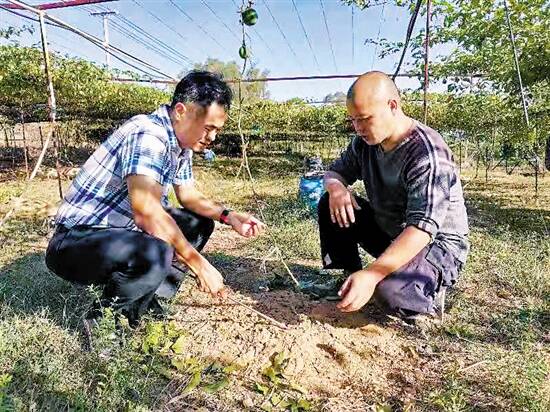■扶贫工作队队长与种植户探讨黄金百香果种植。 |