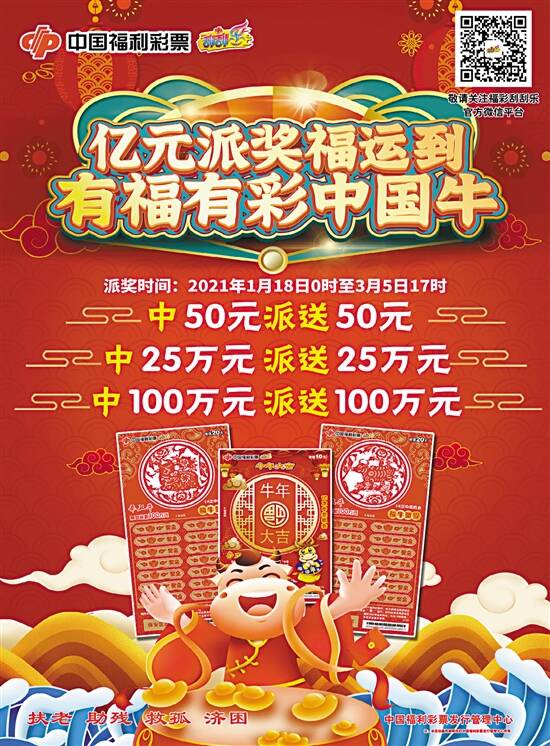 新快报讯 记者陆妍思 通讯员郭新庆报道 牛年到,牛票到!福彩刮刮乐2021年贺岁票“辛丑牛”系列彩票近日携2亿元派奖在全国隆重上市,来自广州市白云区的一位彩民拔得头筹,将全省首个“辛丑牛20元”加料头奖揽入囊中。 夫妻刮牛票抱走200万元 “听说最近有派奖活动,我这张中奖彩票一等奖奖金100万元是可以翻倍的,这是真的吧?”近日,张女士(化名)携带中奖票来到市福彩中心办理兑奖。在得到中心工作人员的肯定回复后,她才放下心来:“能中大奖我们已经开心了,这次还赶上了奖金翻倍的派奖活动,今年真是太幸运了!”张女士和老公来广州工作已有多年,两人都是福彩刮刮乐的粉丝,“简单、好玩,只要有新票上市,我们都会买上一包试下运气的”。 上周四,张女士下班路过投注站,看到“辛丑牛”新票上市的海报,便去投注站购买了一整包“辛丑牛20元”彩票带回家。“其实这张中奖彩票是我老公刮中的,他手气向来比我强!”张女士回忆说,当晚她从老公口中得知其中一张票中了一等奖,“一开始我可没敢相信,还以为他在忽悠我玩呢”。待看到彩票票面信息,她才确认真的中了奖:“三个图案完全一致,后面的金额写着¥1000000,这可不就是大奖么!”夫妻俩一番商议,决定尽快办理兑奖。“本来想两个人一起过来兑奖的,但考虑到家里孩子还小、需要有人照顾,我就一个人过来了,希望兑奖一切顺利。”张女士说。 派奖活动将持续近两个月 据悉,为配合2021年贺岁票“辛丑牛”系列彩票的上市,中国福彩中心在全国范围内开展了“亿元派奖福运到,有福有彩中国牛”派奖活动。派奖活动针对10元、20元面值“辛丑牛”生肖票派奖,自2021年1月18日0时起,3月5日17时止(以销售系统实际兑奖时间为准)。活动期间,对单张彩票兑取“辛丑牛”生肖票50元、25万元以及100万元三个奖等的购彩者派奖,每个奖等的派奖金额等于相应奖级的设奖金额。具体为:兑取50元的中奖者,派送50元固定奖金;兑取25万元的中奖者,派送25万元固定奖金;兑取100万元的中奖者,派送100万元固定奖金。本次活动派奖费用预计2亿元。若派奖期内派奖奖金派发完毕,派奖活动自然截止。 “辛丑牛”怎么玩? 2021年福彩刮刮乐生肖票“辛丑牛”系列彩票共分为5元、10元和20元三个面值,在派奖前对应头奖分别是10万元、25万元、100万元。其中,“辛丑牛5元”刮刮乐彩票是一款生肖纪念主题双联票,采用中国剪纸的艺术表现形式,共有8个奖级、6次中奖机会,最高奖金10万元;“辛丑牛10元”票面设计将铜钱元素与活泼的卡通牛搭配,采用简单、易上手的“对数字+特殊图符翻倍”玩法,共有10次中奖机会,共9个奖级,最高奖金25万元;“辛丑牛20元”设计延续往年生肖票传统风格,采用“三同图+特殊图符翻倍”玩法,共有14次中奖机会,共13个奖级,最高奖金100万元。