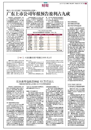 新快报讯 记者涂波报道 2020年,广东抓住改革红利收获了IPO大年,全年新增境内上市公司60家,连续三年新增数保持全国领先。从2020年A股上市公司年报预告来看,截至1月21日,广东上市公司已