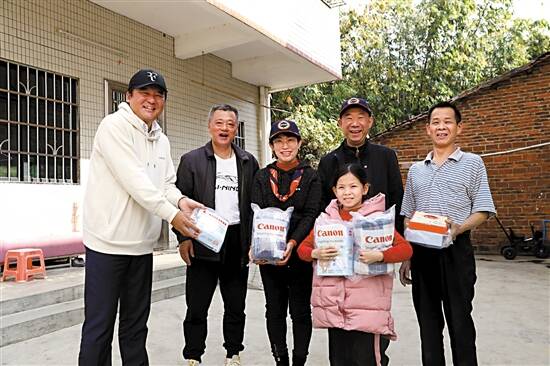 ■新快报社社长、总编辑许志权(中)与佳能(中国)有限公司副总裁,华南区域总部首席代表中岛浩司(右一)一起为村民送出“幸福大片”。 |