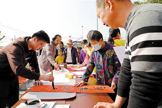 ■两位年轻的书法家现场为村民书写春联和“福”字。 |