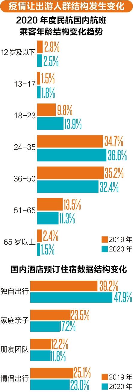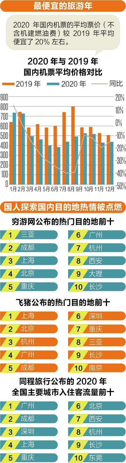 春节黄金周很快又要到来,在多地发出就地过年号召的特殊时期,大家今年还是“宜静不宜动”。既然身不宜远行,不如跟随新快报整理了的旅行数据,来一场云端上的心灵旅行。如何? 近日,多家在线旅游销售网站发布了2020年度旅行消费报告。毋容置疑,2020年的新冠肺炎疫情直接改变了人们的出游习惯。当出境游受阻,1.55亿出境游人群纷纷将目光投向国内。那么,大家喜欢怎么玩? 综合数据显示:国内游的逐步深化、预订提前量缩短、玩法更加多样等成为了去年旅客出游的新特点。内循环模式下,也给中国旅游业的发展带来了不少机遇。 ■策划:新快报记者 罗韵 ■统筹:新快报记者 梁彧 ■采写:新快报记者 李佳文 实习生 苏昉 ■制图:廖木兴 疫情改变了出游人群结构和预订行为 同程旅行发布的《2020年度国内居民旅行消费报告》显示,疫情对2020年旅行消费人群的结构产生了不少影响。疫情期间,出于安全考虑,中老年人旅行跨省长途旅行需求显著下降。另外,各地中小学校出于疫情防控需要,均建议在校学生尽可能减少跨省旅行,此举对家庭出行需求亦起到了一定的抑制作用。 同程旅行的机票大数据也显示,2020年1至11月,65岁以上高龄机票用户的比例较2019年同期降低了36.7%,18至23岁的青年用户的比例则上升了42.7%。2020年度机票用户的年龄结构变化总体呈现出两头(儿童和老年人群体)降中间(中青年群体)升的趋势。国内酒店预订住宿大数据也显示,2020年国内居民家庭亲子出行比例为17.2%,与2019年度相比减少了6.3个百分点。而在飞猪平台上,95后首次成为出游主力军,00后旅游预订量增速最快,同比涨超180%。 疫情也改变了出游者的预订行为。机票预订方面,行程预订的提前量大幅缩短,与2019年相比,出发前三天内预订的比例显著提高。住宿消费方面,当天下单的比例提升了6个百分点,而提前8天以上下单的比例同比减少了一半以上。居民对于旅行安全的关注度明显提高,疫情期间民航旅客购买相关保险(健康险、航意险、取消险等)的比例显著高于往年同期,也高于2020年下半年的平均水平。 出境游改国内游,花的钱和时间没减少 受国际疫情形势影响,2020年国际航班量大幅减少,我国居民国际旅行需求大幅萎缩,旅行消费开启“内循环”模式,1.55亿出境游人群目光落回国内。根据穷游网1月18日发布的报告显示,2020年3月以来,穷游网站内国内目的地浏览量月增长率甚至超过了400%,7月后,行程助手行程规划月增长率超过40%,83%出境游的用户转变为国内游。 即使无法出国,用户花在旅行上的时间和费用也基本没变。相较于国外一次出行时长多在8天以上,国内出游虽时长多为3-5天,但频次更多,65.8%的用户一年在4次以上。此外,在旅游花费上,有46.3%的用户国内旅游年均花费超过30000元,出境游群体在旅游上花费的时间与金钱并未减少。 低票价让2020成为最便宜的旅游年 同程旅行的机票大数据显示,2020年国内机票的平均票价(不含机建燃油费)较2019年平均便宜了20%左右,大量国内航线出现了比同行程高铁二等座更便宜的机票。分地区来看,成都、重庆、深圳、西安、贵阳、上海等热点城市的进出港航班量及客运量总体复苏趋势非常强劲。 去哪儿网大数据研究院院长兰翔举例,在往年,临出发前三天,京沪、京蓉、京广、京深这种商务干线机票的价格往往只剩下六折以上的“高价票”,有些航班价格往往仅剩全价经济舱。到了2020年,除了“十一”期间,消费者在出行前一天都能买到四折以下的特价机票。机票票价降低,刺激了大众的民航出行需求。去哪儿网的数据也显示,2020年人均出游成本同比2019年下降一成。2020年可谓最便宜的旅游年。