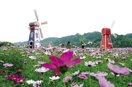 ■在肇庆市封开县江口街道台洞打造的一处花海网红景点,清澈美丽的贺江边,格桑花、风车城堡吸引了众多游客。 |