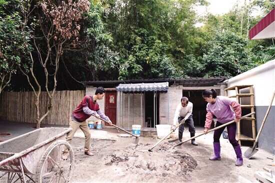 ■村民孔德煌一家人正在对门前的庭院进行硬化改造,希望能吸引游客发展餐饮。 |