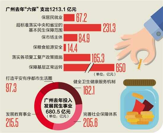 预算报告提出,将安排266.5亿元推动经济高质量发展 昨日上午,广州市第十五届人民代表大会第六次会议开幕,广州市财政局局长陈雄桥向大会报告《广州市2020年预算执行情况和2021年预算安排草案》(下称《预算报告》)。《预算报告》显示,2021年市本级财政共计安排551.4亿元预算用于普惠性、基础性和兜底性民生保障工作,较上年增长17.5%。 其中,在社会保障方面,较大规模的支出包括安排21.8亿元保障底线民生,加强对低保、低收入困难家庭认定、特困人员供养等救助,落实对退役士兵、优抚对象等人员社会保障机制;安排58.5亿元保障城乡居民及机关事业单位退休人员养老待遇及时足额发放,加大对困难群体参加社会保险政府资助力度实现“应保尽保”,安排37.8亿元完善以公共租赁住房为主的住房保障体系,对城镇户籍中等偏下收入住房困难家庭的基本居住需求实行应保尽保,多渠道筹集保障性住房新增、改建、盘活租赁住房4万套,发放租赁补贴1.5万户。 在备受关注的教育领域,今年将安排74.6亿元预算用于教师队伍建设及学校日常运营经费;安排28.8亿元支持广州大学、广州医科大学基础能力建设,加快华工国际校区二期和香港科技大学(广州) 建设,支持大湾区建设国际教育示范区引进世界知名大学和特色学院。 疫情的到来让市民对卫健领域也十分关注,今年将安排44.1亿元增强公共卫生服务能力,提升重大传染病、慢性病和精神疾病的防控能力,提升基层医疗服务水平。另外较大的预算资金还包括安排45.8亿元医疗保障政府资助资金,做好全市500多万城乡居民、社会申办退休人员及机关事业单位工作人员的医疗保障。 今年市财政重点领域投入一览 1 以增强科技产业竞争力为核心,推动经济发展迈向“新格局”,安排266.5亿元推动经济高质量发展,较上年增长13.8%。其中: 74.2亿元支持科技创新; 40.1亿元支持发展先进制造业; 152.2亿元对产业园区补助资金。 另外,安排329.3亿元支持加大政府投资与拉动消费。 2 安排295.6亿元推动“ 四个出新出彩”,较上年增长11.2%,其中: 195亿元支持完善综合城市功能; 36.7亿元支持增强文化综合实力; 36.3亿元发展现代服务业; 27.5亿元支持营商环境改革。 3 安排351.2亿元推动城乡融合发展和城市治理,较上年增长3.3%,其中: 165.5亿元支持乡村振兴; 81.6亿元支持生态环境治理; 104.1亿元支持城市综合治理升级。 4 安排551.4亿元扎实做好普惠性、基础性和兜底性民生保障工作,较上年增长17.5%,其中: 184.3亿元支持健全社会保障和就业体系; 221.3亿元支持不断扩大优质教育资源供给; 125亿元支持增加卫生健康服务能力; 20.7亿元支持巩固扶贫援建成果。 去年疫情防控投入近40亿元 今年市本级财政拨款“三公” 经费支出同比增长5.2% 《预算报告》显示,面对突然起来的新冠肺炎疫情,广州去年加大应对力度。其中全市财政投入39.3亿元确保疫情防控、医疗救治、应急设备、物资采购等工作顺利开展。拨付财政直达资金72.6亿元,保障资金“直达基层、直接惠企利民”;投入67.2亿元保居民就业,针对新冠肺炎疫情影响精准实施“一企一策”,加强重点群体就业帮扶,加大对高校毕业生、就业困难群体的就业扶持和援助,投入231.3亿元超标准落实中央和省定的基本民生保障范围,实际投入各项民生事业支出达1976.8亿元;投入84.9亿元用于保市场主体, 出台“暖企15 条” “稳增长48条”“信用助企9条” 等一揽子政策措施,预计全年减税降费超1000亿元,对承租市属行政事业单位和国有企业的物业租金给予减免,预计全年减免租金13.4亿元,惠及5万多户中小微企业和个体工商户。 另一方面,2021年市本级财政拨款“三公” 经费支出29515万元,同比增加1457万元,增长5.2%,其中因公出国(境) 经费预算7305万元,与基期、同期持平,公务用车购置及运行维护费预算19163万元,增加1862万元,增长10.8%,公务接待费预算3047万元,减少405万元,下降11.7%。 去年广州市财政重点领域投入 1 “六保” 支出1213.1亿元,其中: 全市财政投入39.3亿元确保疫情防控、医疗救治、应急设备、物资采购等工作顺利开展,拨付财政直达资金72.6亿元,保障资金“直达基层、直接惠企利民”。 2 共计投入301.8亿元推动三大攻坚战, 较上年增长32.7%,其中: 22.7亿元推进帮扶援建工作 140.5亿元推进污染防治工作 3 共计投入460.6亿元推动“四个出新出彩”, 较上年增长47.8%,其中: 359.5亿元提升基础设施功能 48.3亿元增强文化综合实力 25.3亿元发展现代服务业 27.4亿元营造国际化法治化营商环境 4 共计投入502.3亿元推动经济高质量发展,较上年增长14.7%,其中: 103.8亿元支持科技创新 55.8亿元推进制造业高质量发展 172.1亿元推进乡村振兴 产业园区补助资金170.6亿元 “十三五” 全社会研发投入占GDP比重增长全国居首 民生投入比“十二五”增加逾八成 预算报告中还提及了“十三五”的财政收支情况,“十三五”期间,广州市财政总收入达到16366亿元,比“十二五” 时期增加5870亿元,增长55.9%,全市税收收入累计完成6179亿元,比“十二五” 时期增加1635亿元,增长36% 。 “十三五”期间全市财政总支出达到20211亿元,比“十二五” 时期增加8611亿元,增长74.2%。 在此期间,广州市一般公共预算投入经济领域支出合计1367.5亿元, 比“十二五” 时期增加588亿元,增长75.4%。广州坐拥国家、省重点实验室分别达到21家和241家,实有市场主