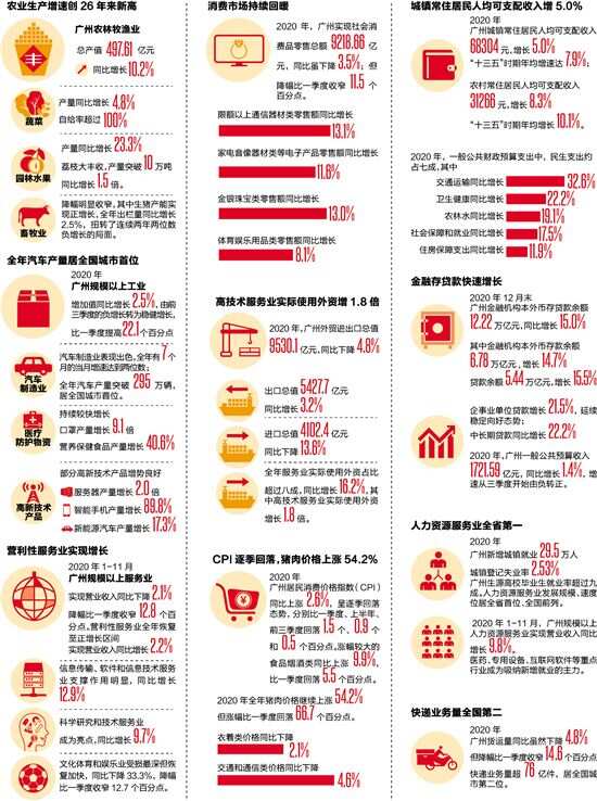 经济在疫情冲击中体现出活力和韧性 1月29日,广州市统计局举行新闻发布会。根据广东省地区生产总值统一核算结果,2020年广州地区生产总值25019.11亿元,同比增长2.7%。其中,第一产业增加值为288.08亿元,同比增长9.8%;第二产业增加值为6590.39亿元,同比增长3.3%;第三产业增加值为18140.64亿元,同比增长2.3%。 从2020年经济运行轨迹看,一季度-6.8%、上半年-2.7%、前三季度增长1.0%、全年增长2.7%……广州市统计局副局长冯俊表示,2020年广州经济在疫情冲击中体现出活力和韧性。“前三季度广州经济增速与全国、全省同步实现转正后,经济恢复势头进一步向好;进入第四季度,各主要经济指标基本恢复常态,无论是地区生产总值规模、增速和投资、金融、价格等宏观指标,还是就业、失业率和居民收入等微观指标,都显示着奋力向好的广州经济交出亮眼答卷。” 记者了解到,“十三五”期间,广州地区生产总值从18560亿元提高到25019亿元,5年跨越7个千亿元台阶,年均增长6%。人均地区生产总值突破2万美元,达到高收入经济体水平。 ■采写:新快报记者 王彤 通讯员 穗统宣 ■制图:廖木兴