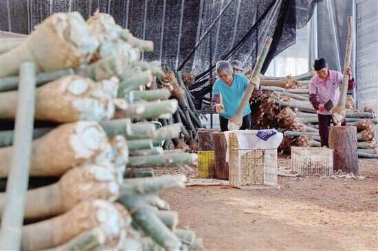 ■加工大棚内,多名工人正忙着加工发财树。 |
