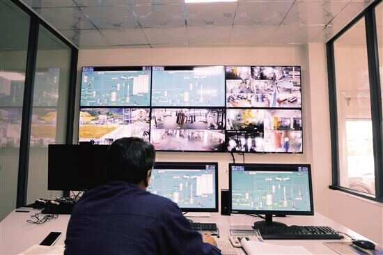 ■云浮市云安区绿色日化产业集聚区内,工人在查看全自动化设备的运行情况。 |