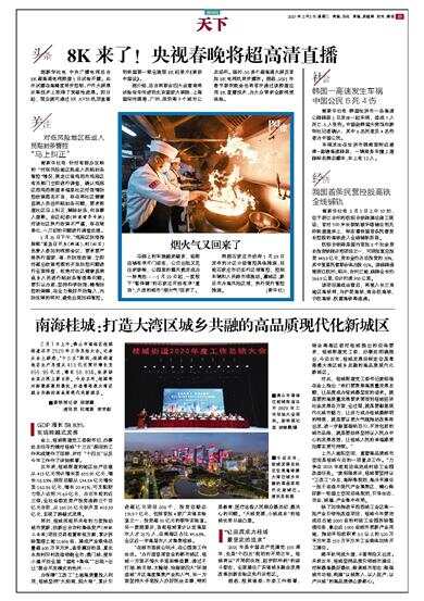 据新华社电 中央广播电视总台8K超高清电视频道1日试验开播。此次试播在高精度同步控制、户外大屏展示等技术上取得了突破性进展。即日起,观众就可通过8K AVS3机顶盒看到我国第一部全流程8K纪录片