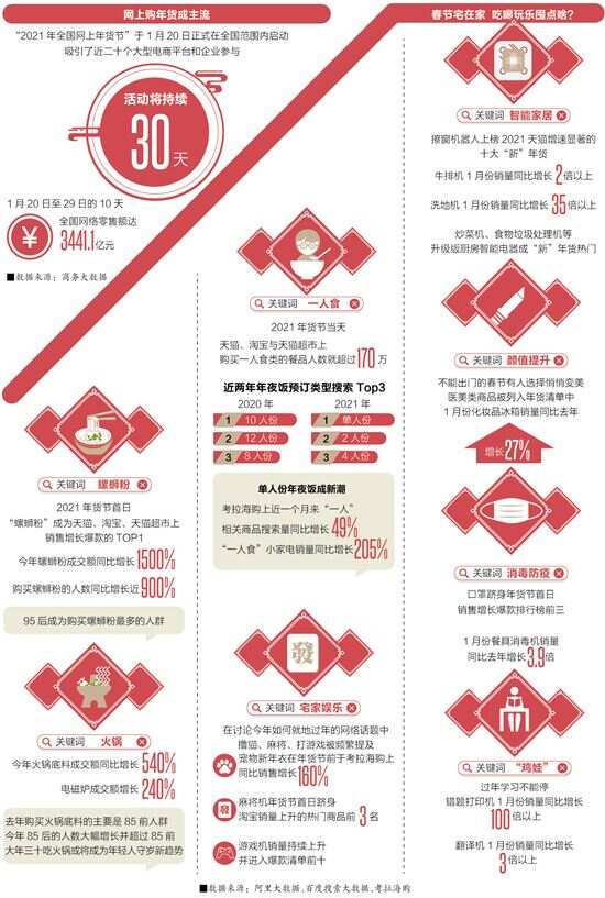 春节临近,越来越多人响应“就地过年”的号召,然而无论家人是近在咫尺还是天南地北,“年味儿”都是不可或缺的,备年货依然是必选项。商务部同中央网信办、工业和信息化部、市场监管总局、国家邮政局、中国消费者协会等部门和单位,共同指导电商及相关企业举办“2021年全国网上年货节”(下称“年货节”),点燃了今年全民网上购年货热度。根据百度搜索大数据,近30天,“年货节”的整体搜索热度环比上涨556%。今年热销的年货除了糕点、糖果、坚果、膨化食品、腊味这些传统年货,各类方便食品如螺蛳粉、自热火锅等均有上榜,这些一人餐速食产品无疑是应对春节期间餐厅疫情防控的不二之选,同时也反映了“就地过年”的大趋势。 ■策划:新快报记者 罗韵 ■统筹:新快报记者 梁彧 ■采写:新快报记者 梁彧 ■制图:廖木兴 ■数据来源:百度《百度2021年货搜索大数据》、天猫《2021年新年货趋势报告》、京东《2021春节年货地图》、考拉海购、商务大数据、阿里大数据