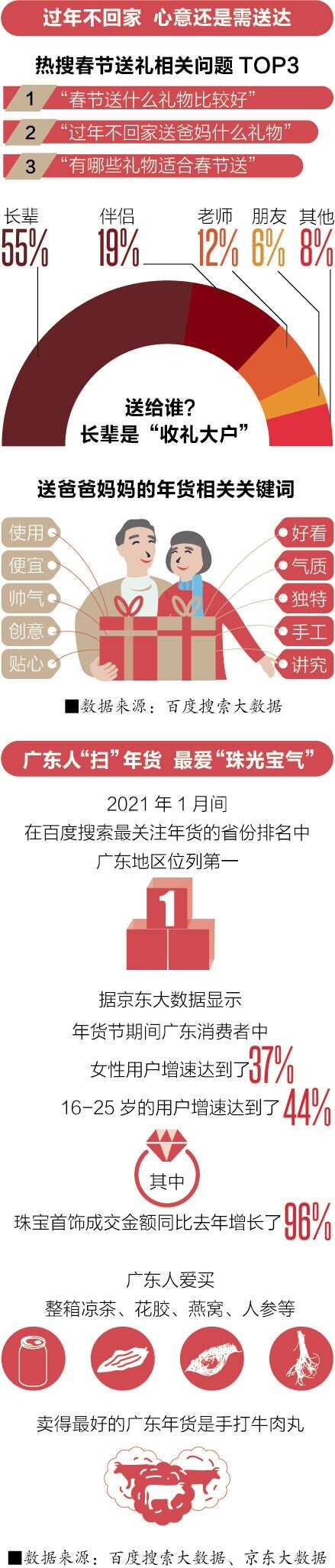方便食品增长15倍 半成品菜成年货消费新潮流 在去年的调查中,新春消费主力人群仍然是80后,今年90后就已经接棒成为年货购置主力军了。2021年1月期间,在百度对“年货”有相关搜索的年龄层占比中,90后占34%,80后占33%。年货节期间,90后用户在天猫上下单比重超过六成。 随着年轻人接棒“年货采办权”,年货清单里就多了不少新品类,方便速食类食品就是其中一项增长最为明显的类目。据天猫淘宝发布的数据,自年货节启动以来,方便食品的增长高达15倍,而在京东平台上1月17日至23日的销量超过70万份,销售额超过2000万元。同时,根据慢慢买大数据对热销商品的数据统计来看,统一、双汇、好欢螺、康师傅、梅林、嗨吃家等品牌的上榜商品销量和销售额周环比都有不同程度的上涨。 除了螺蛳粉、自热火锅、酸辣粉,半成品菜和即食菜也成为今年年货消费的新潮流。据悉,大年夜前夕,唐宫、陶陶居、广州酒家等地方老字号将在重点城市的天猫超市推出年夜饭半成品礼盒,满足3-8人不同规模家庭年夜饭需求。盒马的数据显示,今年较去年新增了10%的餐食半成品新品,销售环比增加5%。考虑到半成品购买将在春节前一周爆发,这一数字在春节前将持续增长。广州金融城白领罗小姐告诉记者,往年春节回乡下都是由亲戚张罗家乡菜做年夜饭,今年和表弟一家就地过年,打算第一顿饭在盒马买火锅汤底和配菜,第二顿饭就吃外卖半成品盆菜:“不会做饭的家庭通过预订各种半成品菜搞掂年夜饭,开心。” 在外卖平台点餐,到线上囤自热锅,去新零售超市买新鲜半成品。据商务大数据监测,年货节期间,全国在线餐饮交易额同比增长49.6%,外卖同比增长60.7%,半成品、特色年菜同比分别增长375.6%和122.2%。餐饮零售化正不断升级,通过数字化的餐品标准化能力与餐配技术,让不做饭不囤年货的人群也能在大年三十踏踏实实备足一桌热腾腾的年夜饭。 新春送礼孝心显著 “科技品”成送长辈首选 在青睐年货的类型上,不同年龄段各有不同。百度搜索大数据显示,以90后为代表的年轻群体的年货清单集中为数码产品、美妆与零食——手机、蓝牙耳机与车厘子的搜索关注度位列前三。同时,年轻人的清单里还出现了不少“新年货”。桌游纸牌、胶囊咖啡、手机壳进入年货清单的前十。与年轻人相比,父母辈的年货清单中,水果与坚果,传统年货主角也占有一席之地,但也出现了不少智能化、数字化的产品。手机、电脑、智能音箱……父母已经悄悄开始了对家庭“智慧化”的改造,其中包括家务装备,洗地机1月份在天猫的销量同比去年增长35倍以上。而父母种草的“麻将机”对于年轻人来说一样有吸引力,麻将机年货节首日在天猫、淘宝上成交同比增长一倍多,跻身淘宝销量上升的热门商品前三名。 年轻人的数码产品年货,不仅自用,还送礼。在新春期间通过送礼的形式传达新春祝福是由来已久的传统,今年春节即使不回家不串门,但情意依然会到,尤其是对长辈。据百度搜索大数据显示,在年轻人热搜的送礼对象中,长辈位列第一,占比55%,其次是伴侣、老师。此外,朋友也占有一定比重。在90后候选送长辈的礼物中,科技品如手机、扫地机器人与智能音箱,超过了保健品,成为榜上TOP3,其他入榜产品则有按摩椅、护肤品、泡脚桶、养生壶等,基本与健康有关。 从搜索送礼问题的性别占比来看,女性要比男性高出54%,“小棉袄”属性显露无遗。同时,送妈妈的礼物比送爸爸的礼物受到更多的关注。在百度上,“送妈妈”的关键词热度明显高于“送爸爸”,且前者随着春节的临近而保持更快的上升趋势。在送礼这方面,儿媳与女婿们也很拼。百度通过分析以女婿身份为丈母娘购买年货,和以儿媳身份为婆婆购买年货的搜索行为数据,发现重庆、四川与上海这些南方地区的女婿在春节送礼关注度领跑全国,而山东、陕西与河南等一众北方地区的儿媳更爱为婆婆挑选礼物。 “它经济”火爆 为萌宠购年货成一大亮点 去年春节“宅家”的两个多月里,85、90后的强劲消费力拉动几大品类的快速增长,在随后一年的时间内成为整个消费市场线上化转向最为迅速的品类;而95后的消费重点在智能设备、宠物等上面,在2020年逐渐成为全民消费的较快增长点。 尤其是萌宠经济,根据艾媒咨询数据显示,中国宠物市场规模增长迅猛,2019年为2212亿元,到2020年上升为2953亿元,年复合增长率达到了20%左右。为宠物购年货成为今年年货节上的一大亮点,此前在抖音平台上一则#妈妈给宠物狗囤年货#的视频引发网友热议。抖音网友@你的陈比方 拍摄了一则视频,她下班回家后,发现家里堆着不少标有年货节相关字样的快递,本来以为是过来看她的妈妈给自己提前置办的年货,拆开包装后才发现,原来是给家中狗狗置办的。一向精打细算的妈妈为狗狗的年货花费2000多元。网友直呼“简直人不如狗”。 天猫年货节数据显示,为了让萌宠们也能感受年味、精致地迎接新年,铲屎官们正积极为爱宠提前囤好粮食、零食和玩具,猫零食同比增长超670%,猫狗保健品增长超400%,宠物玩具增长超900%。宠物新年衣不但成为天猫“新年货”代表,还成为海购新宠。考拉海购数据显示,年货节前,宠物拜年服销售增长160%。在抖音年货节上,宠爸宠妈们对狗狗的“宠爱”略胜猫咪一筹,狗狗用品较猫咪用品成交量高13%。 “就地过年”或为“宅经济”再添一