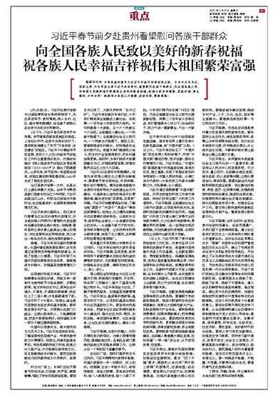 习近平春节前夕赴贵州看望慰问各族干部群众 据新华社电 中华民族传统节日农历牛年春节即将到来之际,中共中央总书记、国家主席、中央军委主席习近平来到贵州,看望慰问各族干部群众,向全国各族人民、