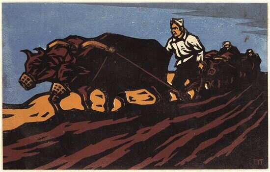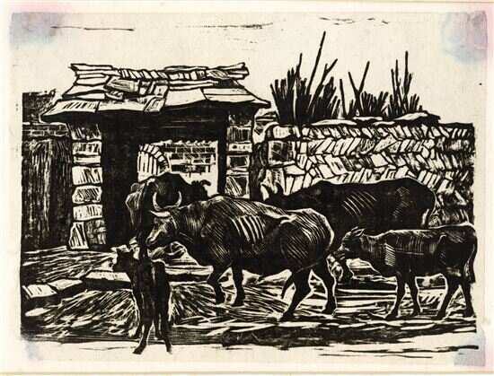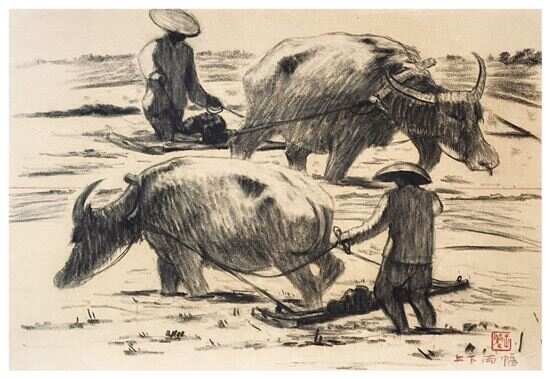 ■收藏周刊记者 潘玮倩 通讯员 曾睿洁 过去的一百年,浓烈的变幻和追寻,极大地激发着艺术家们感知和智性的蓬勃绽放,对于“美术”的重新诠释,折射出人们对外延世界和内深心灵的双重艰难求索,而在这种艰难之中,毫无疑问地诞生了飞跃的加速度。 每一个境遇,都如套在牛身上的犁,碾碎从前土块,耕出槽沟,成为下一次播种的最好准备。 他们取得了一场又一场的丰收。 王肇民:刻画对人民和土地的深情 王肇民是中国著名美术家、美术教育家,熟稔多种艺术形式,对于素描、水彩、国画、油画皆擅长,且善作古体诗词。他在单纯明确的画面中营造的庄正大度,确立了当代水彩画的一种全新审美标准。 他是一个很擅长因地制宜的人,不管去到哪里,似乎都能找到激发灵感之处—— 求学北平,绘《景山》;滞留重庆,写《登高》;于武昌,日夜驻点长江大桥,留下工地盛景;而在被命运推至的每一个田间垄头,他画下对人民和土地的深情。 上世纪五六十年代,日复一日早出晚归农活之余,他曾用生产队会计记账的毛笔,画着人物速写,创作《打谷车》《饲养员》等一批画作。今天我们看到的许多以牛为题材的画作,也都诞生于那段岁月。 牛,是他经常观察的对象,他画下它们的劳作、休憩、漫步。受限于当时材料,有时色彩和线条不同于前,如何在匆忙的时间中勾勒出力量和形,则更成为一重考验。我们看他这批画作,能体会出他对画面布局的掌控,以及在追求真实的前提下,以简洁有力的体积勾勒,来呈现力量的创作手法。 牛,凡耕犁时皆头颅下垂前倾牵引,肩胛骨随之高耸,以示正竭尽全力;而休憩时,多为牛首微昂,肩颈顺滑,四腿更常于浓密的草地中掩映,所有细节,体现出画家对现实的关注和尊重。 李可染:以未泯的童心遥敬田园 李可染是二十世纪的山水大家。曾师从齐白石、黄宾虹,得前者“墨块”“墨线”,后者“积墨”“渍墨”“破墨”之诀,丰富了传统技法的表现力。借鉴西画的明暗处理,创山水画黑、满、重、亮的新画风。 李可染也是一位画牛高手。他从20世纪30年代就开始画牛,一开始画北方的黄牛,后来画南方的水牛,借助中国画特有的晕染效果,将水牛展现得活灵活现。 广东美术馆收藏的这一幅《浅塘渡牛图》,是李可染先生晚年的作品。这幅画创作于1982年,画面着墨不多,形式更简洁,更有现代气息与大师气质。画面章法舒简,用留白来表现水和天,寥寥几笔就画出了双牛的筋骨,浓墨淡墨结合,表现出水牛伏在水中的悠闲景象,生动而富有意趣。上方则是疏柳拂风,春意盎然。牧童坐在牛背上,回首望向远方,这是李可染内心世界的真实写照。 郎绍君先生曾对李可染的牛这样评价:各式各样的耕牛图都造型严谨、笔墨精炼、极富情趣,透露出画家未泯的童心和对诗意田园生活的向往。 胡一川: 视觉冲击之下的埋头苦干 胡一川是20世纪中国美术史上的一位重要革命美术家、教育家。广东美术馆的收藏中,有一幅胡一川先生创作的套色木刻作品:《牛犋变工队》。 这幅作品诞生于1943年,当时正是抗日战争的艰苦阶段,也是开展大生产运动的第二年,正值农业从个体生产走向集体化的起步时期。胡一川先生在延安,深入农村生活,亲眼看到陕北农民变工互助、开荒生产、团结协力克服困难的场面,有感而发,创作了这幅作品。 这幅画的色调浑厚明朗,色块整齐分明,表现了黄土高原上特有的自然环境,具有很强的视觉冲击力。画面中的变工队农民神情严肃,脚步刚毅,以坚定的决心和毅力开拓新生活,对未来充满信心。画面中的耕牛更是奋力向前,体现出一种勤劳憨厚、埋头苦干的“牛精神”。 古元: 真挚的眼睛能看到日常之美 古元的艺术扎根人民。古元1940年从“鲁艺”毕业后,便去碾庄参加农村基层工作,担任当地的文教委员,和农民生活在一起,他时常一个人观察、体验延安的人文风貌,从生活中获取了大量创作题材。他的心中最关注两件事:一是朴实憨厚的陕北老乡;二是自己的艺术创作。 在基层工作期间,古元了解到陕北农民对家畜的喜爱心情,于是创作了《牛群》《羊群》《铡草》《家园》4幅木刻,拓印很多张,分送给乡亲们,深受当地农民喜爱。 求真务实、表现生活中的典型形象和典型事物,是古元的艺术追求。古元的作品里,有浓郁的地方色彩、朴实的民风民俗。包括《牛群》在内的这几幅作品都是农村生活的赞美诗,充分地表现了古元对于农村生活的爱。这些农村的美是土地之子的真挚的眼睛所看见的日常的美。