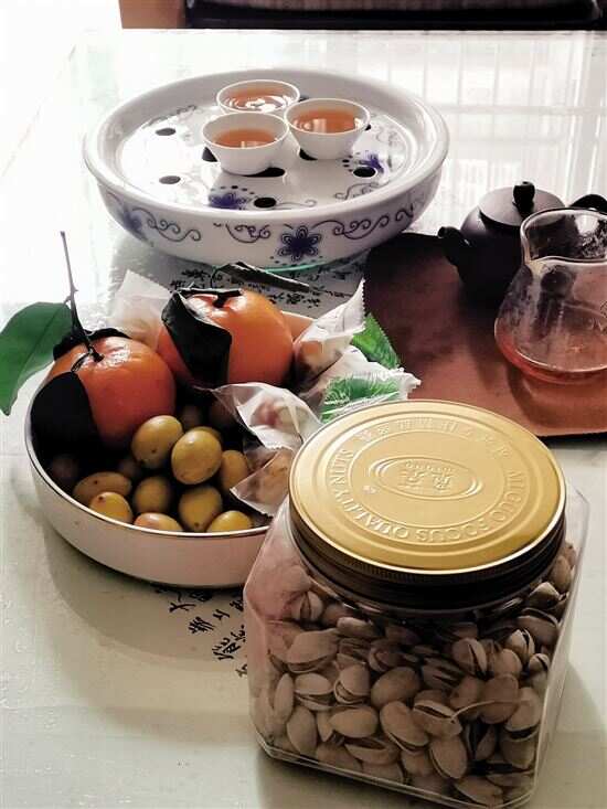 ■招待客人必上新茶和橄榄。冯树盛/摄 |