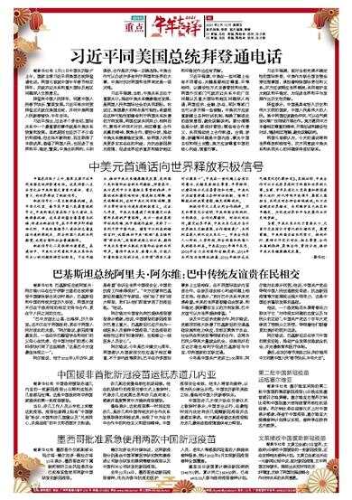 据新华社电 2月11日中国农历除夕上午,国家主席习近平同美国总统拜登通电话。两国元首就中国牛年春节相互拜年,并就双边关系和重大国际及地区问题深入交换意见。 拜登向中国人民拜年,祝愿中国人民