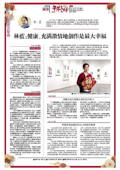 文化大家贺新春 林 蓝 1971年生,广东潮州人。现为广东画院院长、广东省美术家协会副主席、广东省中国画学会副会长。曾获广东省“南粤优秀教师”、广东五四青年奖章、中国教育部“新世纪
