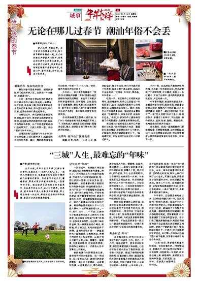 我和我的春节 ■高镛舒(潮汕广州人) 家人在哪,年就在哪。由于求学工作离家人不远,每个春节都和爸妈在一起。从儿时的烟花声锣鼓声门铃声,到现在的云拜年云利是云旅游。无论在哪儿过春节,母