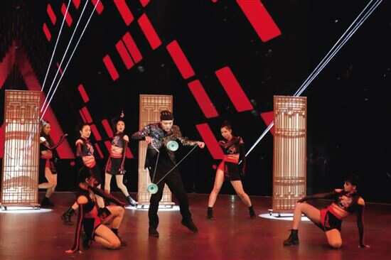 ■酷帅男孩赵志翰采用中国扇来抖空竹。 |