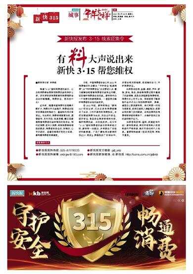 新快报发布 3·15 线索征集令 ■新快报记者 林钢威 每逢“3·15”国际消费者权益日, 公众的视野都会聚焦到消费权益的保护上来,历年来很多消费黑幕和消费陷阱会在此时被揭露。消费