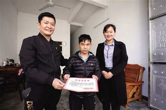 ■钟锦活(中)靠着政策帮扶和自身的努力,捧起了这张“脱贫光荣证”。 |