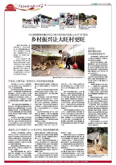 中山南朗镇帮扶肇庆市江口街大旺村振兴发展,让乡村“旺”起来 “孵苗、养殖、销售一条龙都学会了,以后不用帮扶,自己都能规模养殖杏花鸡了”;全家就业,日子好起来后,纷纷建起了房子;从脏乱差,到“先进卫生村”“宜居村庄”…… 在中山市驻封开(德庆)县扶贫工作组、封开县扶贫办的指导协调下,肇庆市封开县江口街大旺村的对口帮扶单位中山市南朗镇和驻村工作队,通过产业振兴、就业推动、文化振兴、生态振兴等努力,开足马力让大旺村更“旺”起来。 产业旺:从零开始一条龙学习,村民养杏花鸡致富 大旺村有人口900多人,山林面积近13000亩,稻田约450亩。相对贫困户20户95人已达到脱贫标准。 在大旺村走访的过程中,新快报记者发现了一个有趣的现象,村里很多家村民都在建房子,其中有几户还是2016年被列入贫困户的村民。在村里人的认知里,能建新房,是日子好起来的一大标志。为什么会有这么多人一起建房子?产业振兴、就业推动带动大家增收,是最大的原因。 “能外出就业的我们就鼓励就业,不能外出的,我们鼓励他们养殖杏花鸡,种植肉桂、段木冬菇等脱贫致富。”中山市南朗镇驻大旺村第一书记冯锦标透露了驻村工作队的帮扶策略。其中发动大家养殖杏花鸡,带动这个品牌产业的振兴,可谓是精准独到。 乡村振兴,产业是关键。封开杏花鸡是广东三大名鸡之首,也是国家地理标志保护产品。驻村工作队自然不会放过“振兴”这个品牌产业。几年来,针对不能外出就业的低收入人群,驻村工作队千方百计鼓励他们养殖杏花鸡致富。冯锦标介绍说,20户贫困户里就有16户在养杏花鸡。 贫困户卢杰初此前也想通过养鸡脱贫致富,但是苦于无技术、无场地。为此,驻村工作队帮他找到了一块山坡地,鼓励他养走地杏花鸡。 “找到场地后,工作队还给我带来技术和鸡苗,这样我才敢放心养。”卢杰初说,现在他养了两百多只杏花鸡,当天刚卖了20多只。此种杏花鸡,一般养到四五斤便可出售,卢杰初也不用担心销路,养大后自有人上门收购。而根据不同市场行情,一只鸡少的能卖到八九十元,多的能卖到100元。 走过卢杰初的养鸡场,到了另一处更高的山坡,便看到一个更大的、搭着鸡棚的养鸡场。冯锦标告诉记者,这是致富带头人徐美群的杏花鸡基地,因为她花了一万多元搭鸡棚扩大生产,帮扶单位还特地奖励她600只鸡苗。 正在鸡舍中忙活的徐美群告诉记者,她和丈夫养有4个孩子,有一个考上了广州的大学,一个考上了技校,还有两个在读小学,家庭压力不小。为了增收,丈夫外出打工,这个养鸡场基本上由她一个人打理。 驻村工作队鼓励大家以“公司+基地+农户”的模式发展杏花鸡养殖后,徐美群也加入其中。帮扶单位为贫困户购买了杏花鸡苗,提供饲料,同时进行技术培训。慢慢的,徐美群学会了养殖技术,销售技能也提升了,现在,她的鸡场养了700多只杏花鸡,她也成了村里的致富带头人,时常有村民主动过来找她交流技术。而因为养鸡日子好起来,她家也正在建房子。 “现在养鸡挺稳定的,标哥他们(驻村工作队)之前帮我们联系了好多商家,鸡养大后,不但在当地可以出售,还销往中山、广州以及广西梧州等地,根本不用愁销路。”徐美群说,2019年,她还尝试孵化了100多只鸡苗。从之前的毫无技术,到现在孵化、养殖、销售一条龙全部掌握,她坦言现在都能完全自主经营,把产业做旺下去。 就业旺:20户贫困户出14名大学生,就业成致富利器 乡村振兴,人是关键因素。日前刚公布的2021年中央一号文件《中共中央 国务院关于全面推进乡村振兴加快农业农村现代化的意见》提出,“对有劳动能力的农村低收入人口,坚持开发式帮扶,帮助其提高内生发展能力,发展产业、参与就业,依靠双手勤劳致富。” 通过促进就业、教育帮扶让贫困人口脱贫,逐步走上小康生活,这是驻村工作队的另一大策略。 梁金兰家的洋楼装修一新,一楼大厅墙白几净,通透整洁,“2019年开始建的新房,2020年终于完工了。”梁金兰说着,脸上掩饰不住笑意。“这房子都是他们两夫妻自己建起来的。”冯锦标在旁补充道。原来,梁金兰的丈夫廖剑元长期从事建筑工作,拥有一定经验,夫妻俩便决定请上两三个工人,自己建起新房。 早年间,梁金兰年迈的母亲生病,儿子尚在上学,家庭压力不小,被定为贫困户。精准扶贫开始后,驻村工作队鼓励夫妻两人去做收入比较高的泥水工,同时引导他们养殖杏花鸡,种段木冬菇等,加上各项帮扶政策的落实,梁金兰一家的日子慢慢好了起来。 3年前,大学毕业的儿子也在广州参加工作。而梁金兰也没有停下来,“现在还在村子里养着300只鸡,很好卖,现在已经卖完了。”她说。 遇到梁木清时,他正从儿子梁建林的新房出来,骑摩托车准备去买菜,身后,施工队正在新盖的三层小楼里忙活。梁建林一家因为上有老人,下有两个孩子读书,被列为贫困户。梁木清告诉新快报记者,儿子梁建林在做搭客生意,媳妇和两个孙子都出来打工,一家日子好起来,才有了建房的底气。 对于教育帮扶的作用,冯锦标觉得不容小觑。他介绍说,村里20户贫困户经过几年脱贫攻坚和自身努力,已有14名学子考上大专以上学历,有9人踏入社会工作,成为了家庭经济主力军。 生态旺: 建好基础设施 打造美丽宜居乡村 在冯锦标看来,要促进乡村振兴,还要壮大村集体收入,加强文化引领,建设好生态家园。 原来的大旺