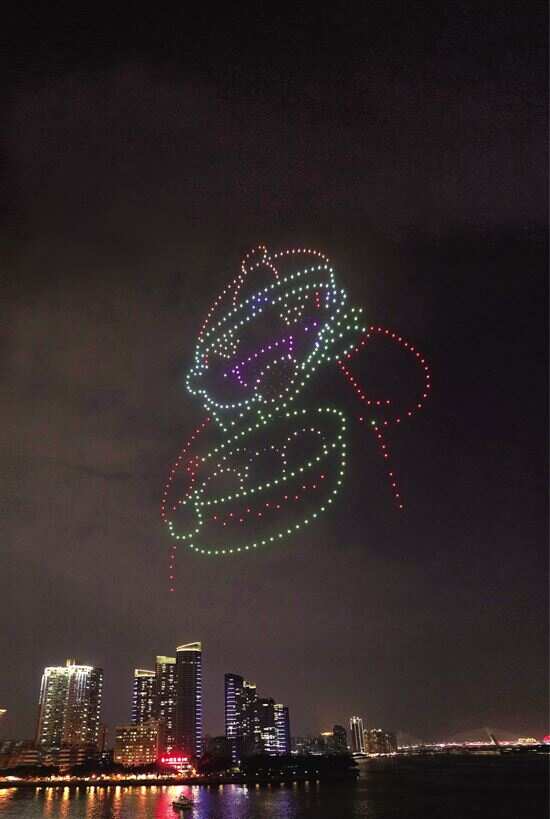 昨晚元宵夜,广州500架无人机闪烁着七彩光芒在白鹅潭畔冉冉升空,不断变换着“汤圆”“灯笼”等图案字样,向市民送上佳节祝福。