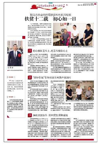全国脱贫攻坚先进个人访谈 阳江市农业农村局扶贫科科长冯帮邢 获奖感言 “作为一名扶贫干部,我为有幸参加打赢脱贫攻坚这场硬仗感到无比自豪。在扶贫一线,还有更多默默奉献的幕后英雄,
