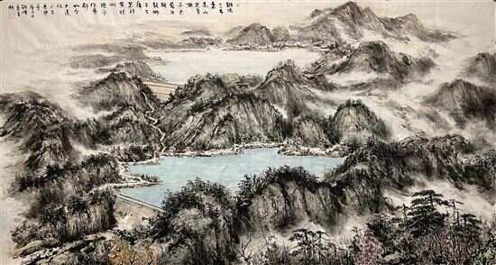 ■温朝晖《梅州抽水蓄能电站》 97x180cm 2021 自题诗:鸡鸣三市处,高山出平湖。千米蓄巨能,龙狮上下库。若非黄猄叫,险些作帝都。如今大造化,不亦长乐乎? |
