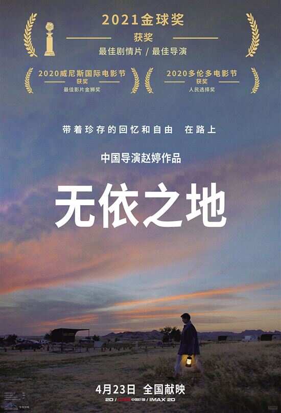 《无依之地》同时获2021年金球奖最佳影片,定档4月23日全国艺联专线上映 新快报讯 记者徐绍娜报道 由中影/华夏发行,中国导演赵婷执导、美国探照灯影片公司出品的《无依之地》昨日正式宣布,将于4月23日在全国艺联专线上映。该片在昨日2021年金球奖颁奖典礼上接连斩获最佳剧情类电影、最佳导演两项重磅大奖,成为金球奖大赢家。 首位获金球奖的华语女导演 《无依之地》由北京出生的中国导演赵婷执导,赵婷也凭借此次获奖成为金球奖史上首位荣获最佳导演奖的中国女导演,她还成为继李安之后第二位获此殊荣的华语导演,也是首位获得此项荣誉的华语女导演。 自执导首部作品《哥哥教我的歌》以来,赵婷独特的叙事视角和简约的拍摄手法就引起影坛关注;她的第二部作品《骑士》击败同年《逃离夺命镇》等热门作品,获得独立电影领域重要奖项哥谭奖。《无依之地》更助她收获近60项最佳导演、最佳编剧相关奖项,创造了新的单人颁奖季获奖纪录数。 《无依之地》成今年奥斯卡大热门 《无依之地》根据杰西卡·布鲁德同名原著改编,由奥斯卡金像奖最佳女主角弗兰西斯·麦克多蒙德领衔主演并担任制片人。该片是赵婷的第三部作品,影片讲述了失去丈夫、小镇解体后,女主角芬恩如何带着回忆在流浪途中找到力量与新生。通过女主角芬恩的双眼,电影见证了在路上生活的壮阔与真实:从南达科他的荒地到内华达的沙漠,再到太平洋西北地区,电影镜头捕捉到了一望无垠的优美景色,再加上取材于大自然的配乐,将女主角逐渐学会与自然相处,感受自然的美丽与残酷、生生不息和治愈力量的过程,细腻地展现出来。 据了解,自2020年秋季亮相以来,《无依之地》就屡屡打破影史纪录:去年十月成为有史以来第一部同时斩获威尼斯国际电影节金狮奖以及多伦多国际电影节观众选择奖的电影。随着颁奖季的进一步到来,《无依之地》的口碑依旧很好,烂番茄指数高达94%。此番在金球奖斩获两项大奖,《无依之地》已经在2020-2021颁奖季收获超过90项大奖肯定,成为今年奥斯卡最大热门之一。