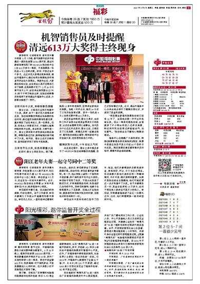 新快报讯 记者陆妍思 通讯员冯慧华报道 2月7日晚,春节彩票市场休市前最后一期双色球第21016期开奖,清远市新城体育馆西门的44180134投注站中出1注613万多元一等奖,中奖彩票是一张机选