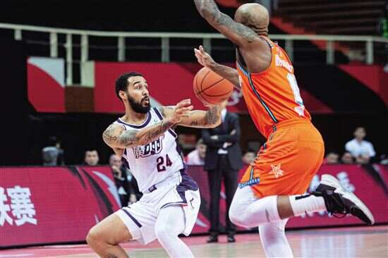 ■时代中国广州队球员摩尔(左)在福建豹发力队球员高登的防守下传球。新华社发 |