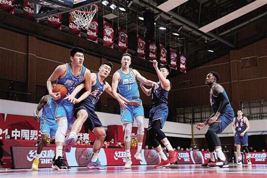 ■广东东莞大益队球员苏伟(左三)与青岛每日优鲜队球员刘传兴(左二)在比赛中拼抢。新华社发 |