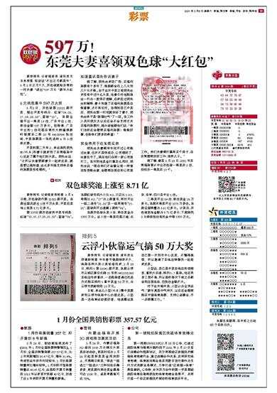 新快报讯 记者陆妍思 通讯员方志良报道 俗话说“不出正月都是年”,3月2日正月十九,双色球就给东莞的一对夫妻“送出”597万元“新年大红包”。 6元机选票中597万大奖 3月2日,双