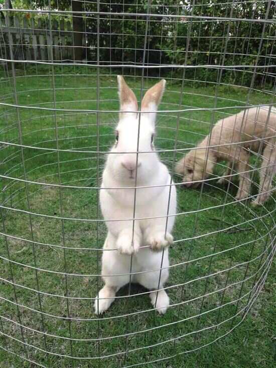 ■玫瑰社的兔子朵拉,她的“围脖”和笼子。 |