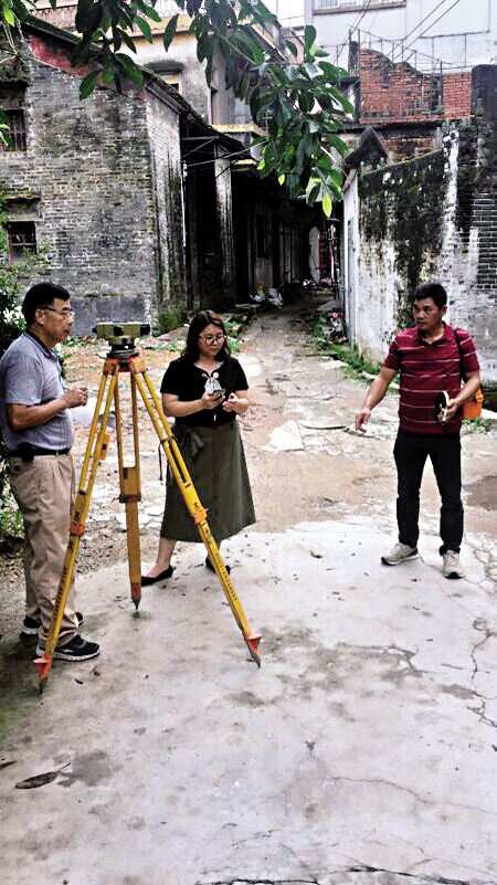 ▲谢美灵和街道城建工作人员现场测量团结街标高。 |