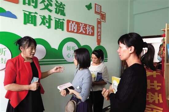■王淑娟(左红衣)在心语屋与学生家长进行家庭教育辅导。 刘红宇/摄 |