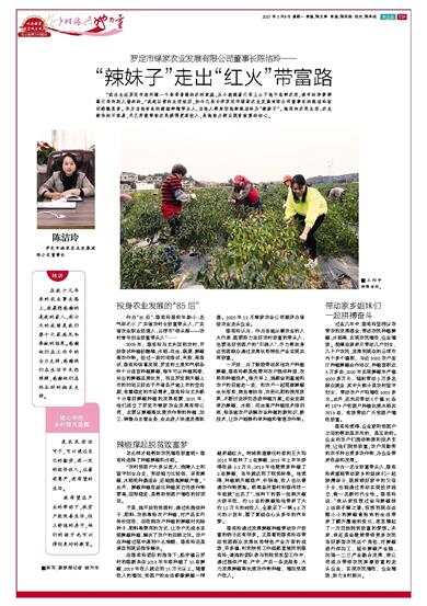 罗定市绿家农业发展有限公司董事长陈洁玲—— “我出生在罗定市连州镇一个非常普通的农村家庭,从小就跟着父母上山下地干各种农活,读书的学费都靠父母向别人借来的。”说起以前的生活经历,如今已是云