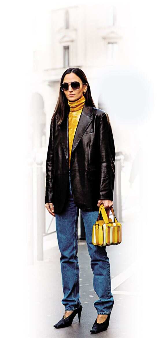 ▲皮革加深了西装的硬朗感,配颜色出挑或性感的内搭,加一双高跟鞋,便化解了稍显过硬的线条。 |